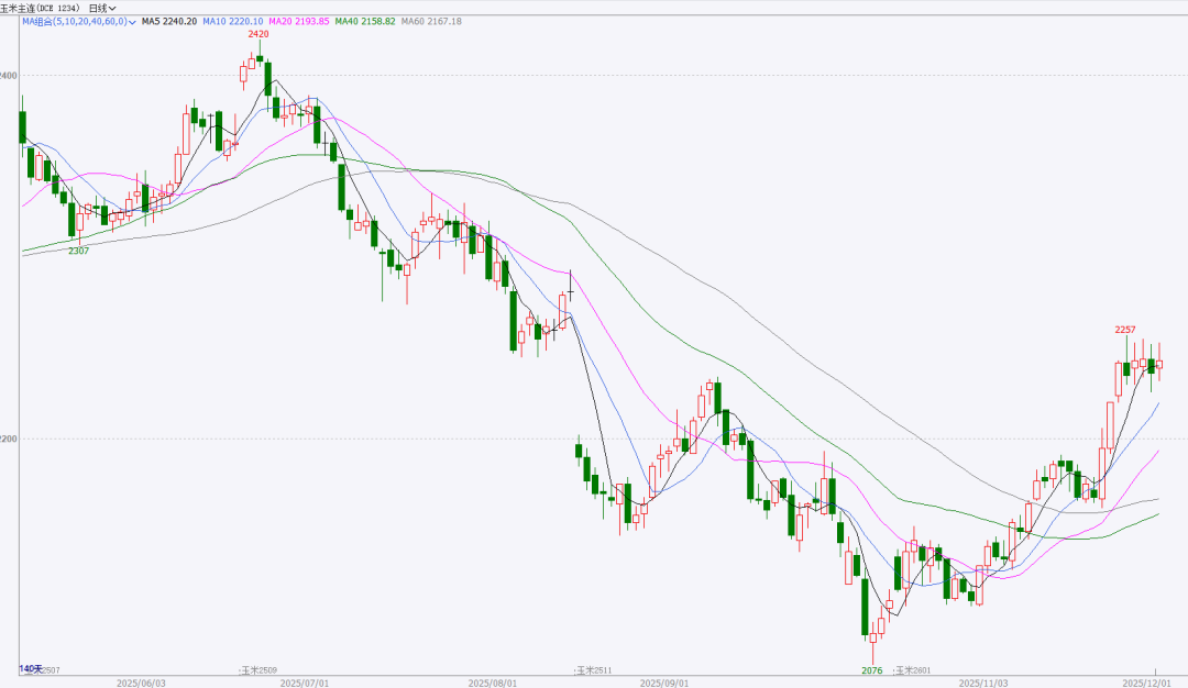 国际方面,截至2025年11月28日当周,全球玉米价格多数上涨。受市场看涨氛围及美国玉米出口销售强劲带动,芝加哥玉米期货周涨2.28%,当周收盘价创5月底以来新高(亦有感恩节假期波动因素)。但连续三天上涨后,周一因多头获利平仓价格回落。美国农业部出口检验周报显示,截至11月27日当周,美玉米出口检验量142.1万吨,周环比降16%,但同比增50%,高于市场预期。本周国内玉米盘面延续上周末震荡走势,上行显压力。周一行情高开低走,收于2236元/吨,跌5元,首次跌破5日均线。周二主力合约再度走强,最高触及2253元/吨,但仍未突破11月26日高点2257元/吨,且锦州中孚提价20元亦未推动盘面突破前高,反映上方阻力较强。
